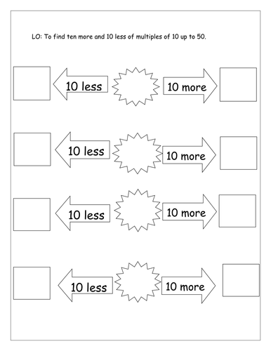 10 More and 10 Less Activity | Twinkl Math Resources USA Challenge your students to find 10 more and 10 less than a number with our 10 More and 10 Less Activity. This is a simple and easy-to-read resource that will be sure to make counting with 10s come easier to your little ones. This illustrated worksheet includes instructional diagrams with counting cubes to teach your class how to visualize a math problem before solving it. It also helps ...